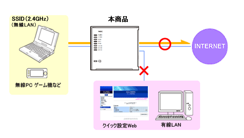 インターネットや同一のSSID側の無線LAN端末(子機)とのみ通信可能です。 |