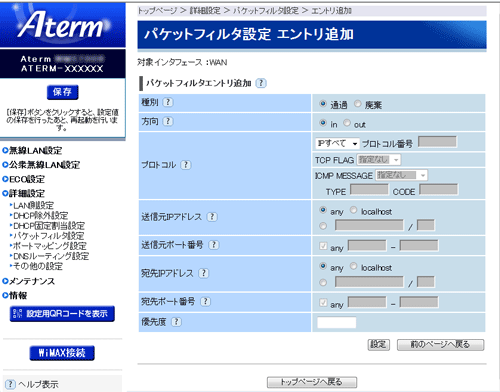 詳細設定−パケットフィルタ設定