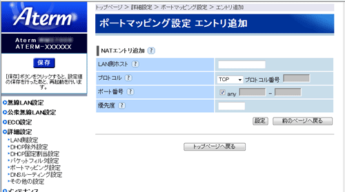 [追加]をクリックすると[ポートマッピング エントリ追加]画面に進みます。 |