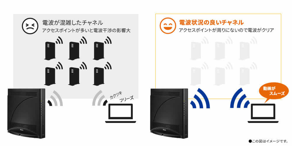 Wi-Fiが途切れる要因のひとつに無線電波の干渉があります。プリアンブルパンクチャリングは、利用中の特定のチャネルが妨害を受けてもそのチャネルを避けて通信する技術で、安定した高速通信を可能にします。