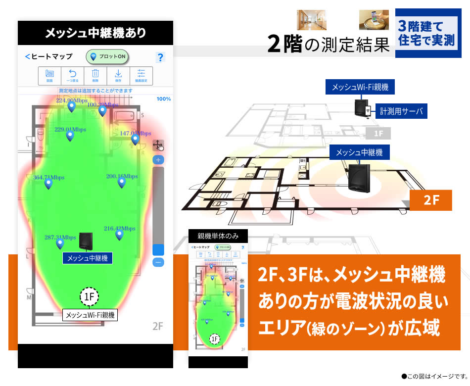 親機単体のみの測定値に対して、メッシュ中継機を利用した場合には2階が約2.5倍、3階は約4.6倍の結果となりました。この結果から分かるように親機から離れた場所の通信速度を高めたい、通信を安定させたい場合には、親機だけでなくメッシュ中継機の利用をおすすめします。