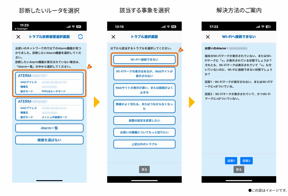 Wi-Fiのトラブルで困った時、本アプリの【トラブル診断機能】で解決方法をご案内します。【トラブル診断機能】を開くと、ご自宅のAtermルータを自動で検索※。あとは画面のメニューからお困りの事象を選ぶだけで、解決方法を確認できます。