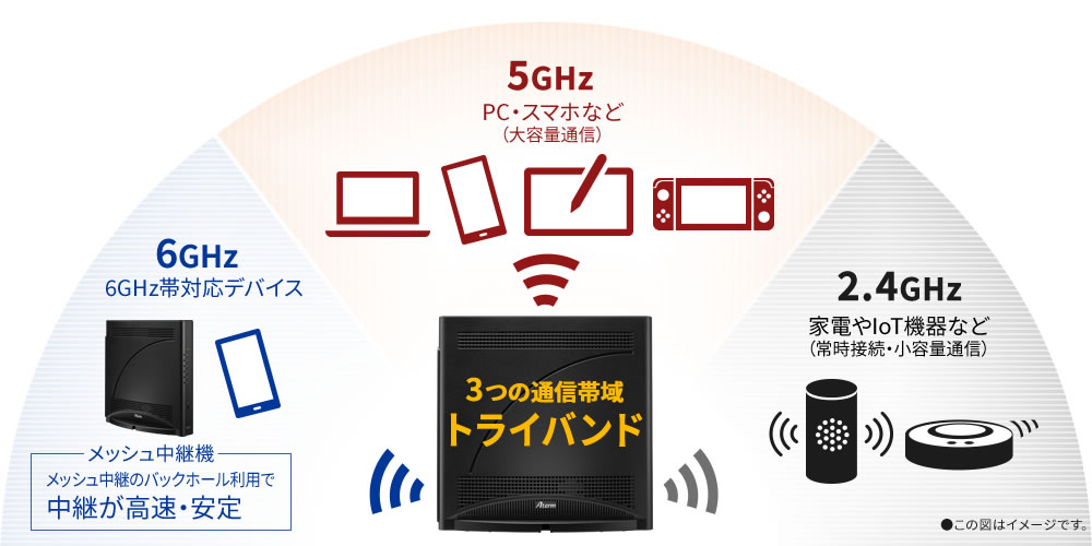 すべて開く詳細を閉じる通信帯域のトライバンド化で3帯域(6GHz帯/5GHz帯/2.4GHz帯)を使い分け