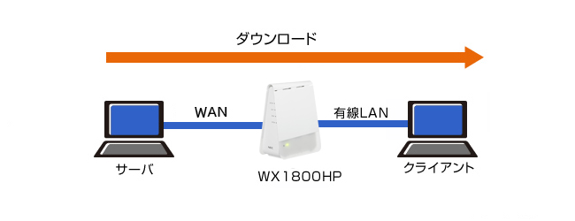 Aterm WX1800HPのWANポートに接続したサーバからLANポートに接続したクライアントパソコンでファイルをダウンロードした場合のデータ転送速度の実測値です。