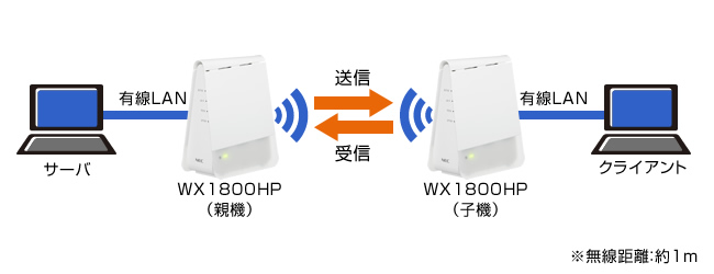 Aterm WX1800HP[ブリッジモード]のLANポートに接続したサーバパソコンからAterm WX1800HP[子機モード]を接続したクライアントパソコンへのデータ転送速度(送信)の実測値です。なお、クライアントパソコンからサーバパソコンへの通信速度(受信)は、送信速度より低い場合があります。