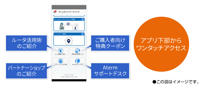 アプリ内の画面下部に、Atermのサポートデスクや公式サイト、お得な情報などへワンタッチでアクセスできるボタンを配置。また、Atermのアップデート情報や新製品情報などをポップアップ通知でご案内します。設定操作に困ったとき、製品の買い替え時などにぜひご活用ください。