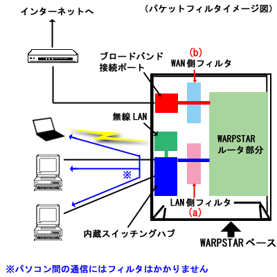 (b)WAN側 WARPSTARとADSLモデム、CATVモデムなどのブロードバンド接続機器間でフィルタを設定します。