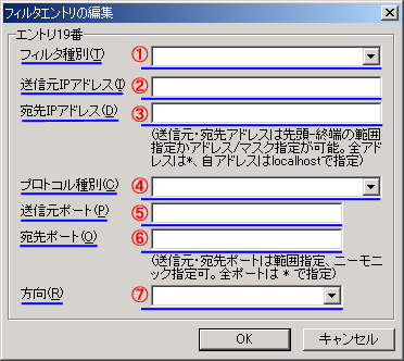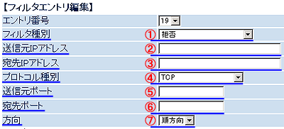 IPパケットフィルタのエントリ番号1番〜18番までは初期のセキュリティ設定のため、システムで利用していますので、任意のフィルタを設定する場合には、19番〜50番までの空いているエントリ番号に設定を行ってください。