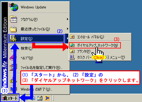 Windows(R) 98/98SEの場合は、「マイコンピュータ」をダブルクリックして、「ダイヤルアップネットワーク」をダブルクリックします。 |