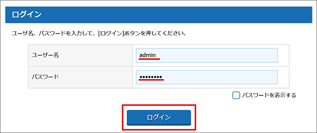 ユーザー名に半角小文字で「admin」、パスワードに管理者パスワードを入力して、【ログイン】ボタンを押してください。