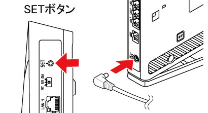SETボタンを押しながら(押したままの状態で)、ACアダプタのプラグを差し込み電源を入れてください。