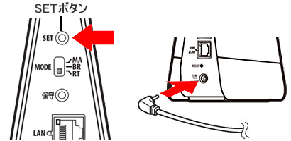 SETボタンを押しながら(押したままの状態で)、ACアダプタのプラグを差し込み電源を入れてください。