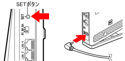 SETボタンを押しながら(押したままの状態で)、ACアダプタのプラグを差し込み電源を入れてください。