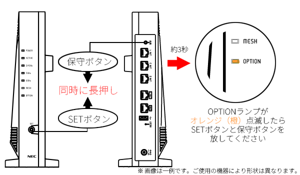 Aterm本体のSETボタンと保守ボタンを同時に長押し(約3秒)して、OPTIONランプが橙点滅したら放します。