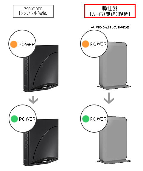 7200D8BEのPOWERランプ点滅後、1分以内に弊社製メッシュ親機の「WPSボタン」を長押ししてください。