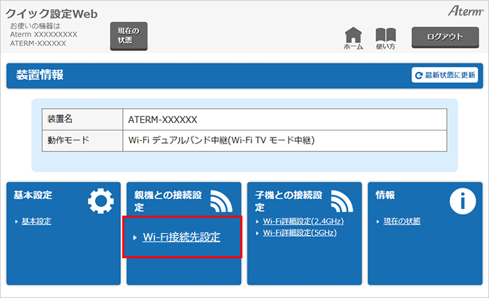 クイック設定Webのトップページから、『親機との接続設定』-『Wi-Fi接続先設定』を選択してください。
