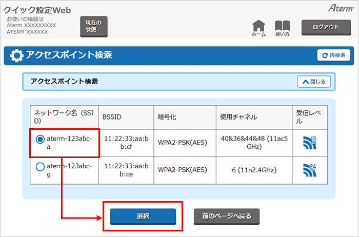 事前にご確認いただいたWi-Fi(無線)親機のネットワーク名(SSID)の横にあるラジオボタンをチェックして、【選択】ボタンを押してください。