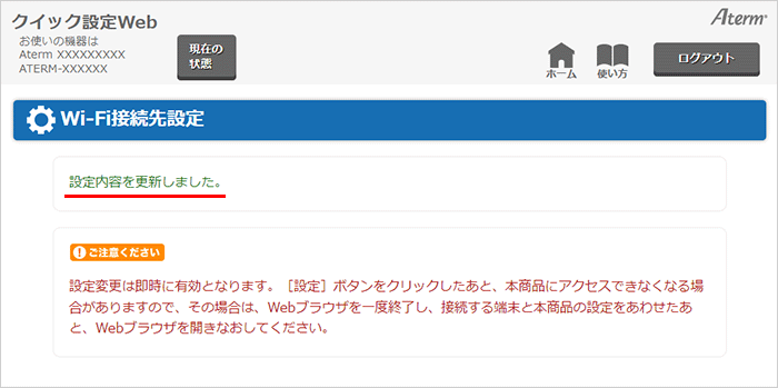 数秒ほど「設定反映中」と表示されたあとに、タイトル(『Wi-Fi接続先設定』)の下に「設定内容を更新しました。」と表示されます。