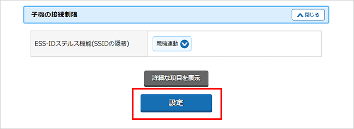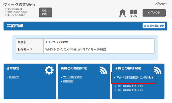 クイック設定Webのトップページから、『子機との接続設定』-『Wi-Fi詳細設定(2.4GHz)』(*1)を選択してください。