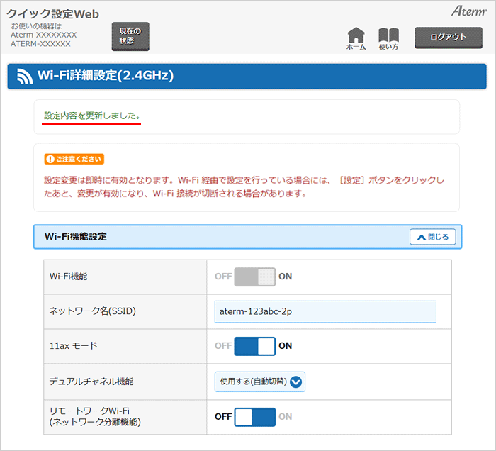 数秒ほど「設定反映中」と表示されたあとに、タイトル(『Wi-Fi詳細設定(2.4GHz)』)の下に「設定内容を更新しました。」と表示されます。
