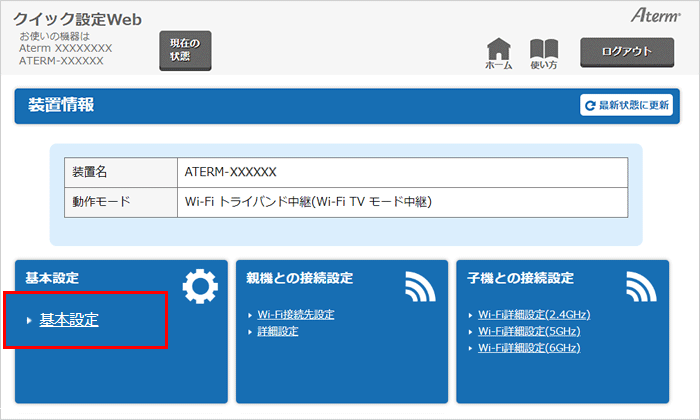 クイック設定Webのトップページから、『基本設定』-『基本設定』を選択してください。