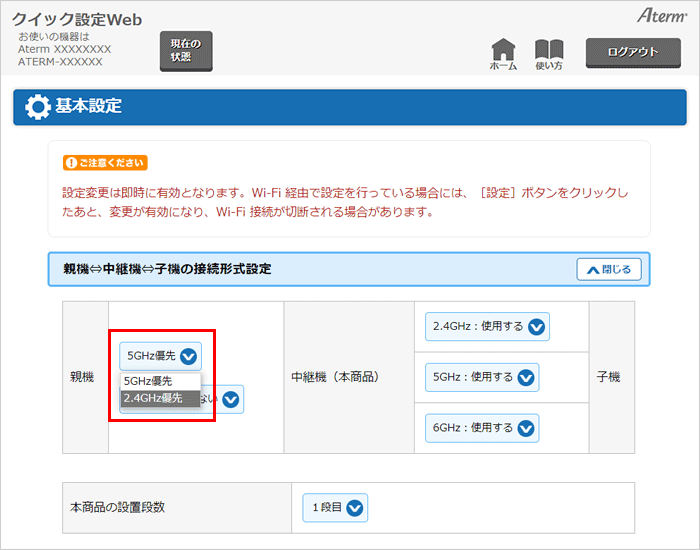 「親機⇔中継機⇔子機の接続形式設定」の[親機]で【2.4GHz優先】に変更してください。