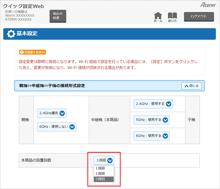 「親機⇔中継機⇔子機の接続形式設定」の[本商品の設置段数]で設定段数を【2段目】または【3段目】に変更してください。