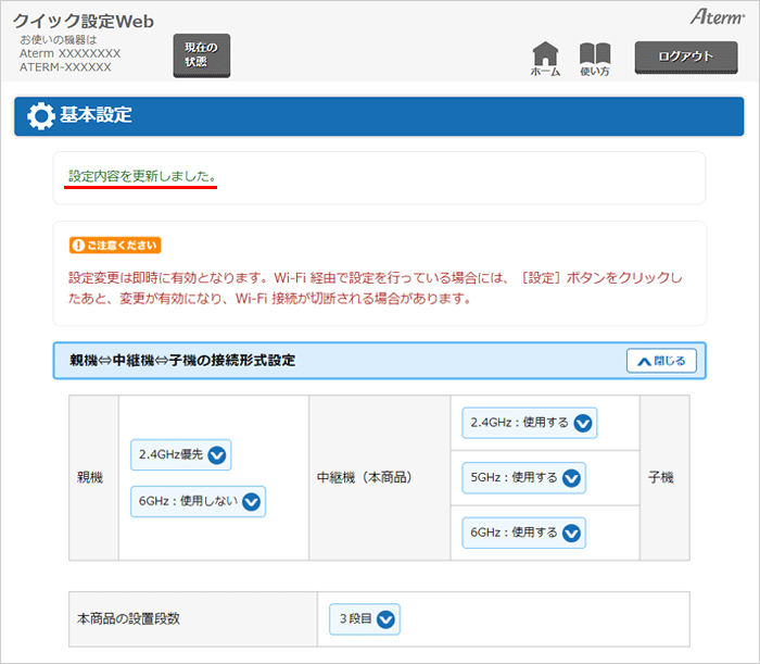 数秒ほど「設定反映中」と表示されたあとに、タイトル(『基本設定』)の下に「設定内容を更新しました。」と表示されます。
