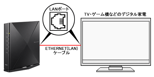 WX5400T6のLANポートと装置(テレビ・プリンタ・ゲーム機などのネットワーク家電)のLANポートを、ETHERNET(LAN)ケーブルで接続してください。