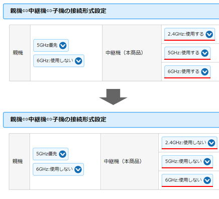 中継機の機能を停止して、子機のみで使用したい場合は、クイック設定Webの『基本設定』で「親機⇔中継機⇔子機の接続形式設定」の「中継機(本商品)」を「2.4GHz:使用しない」「5GHz:使用しない」「6GHz:使用しない」に変更して、設定を保存してください。