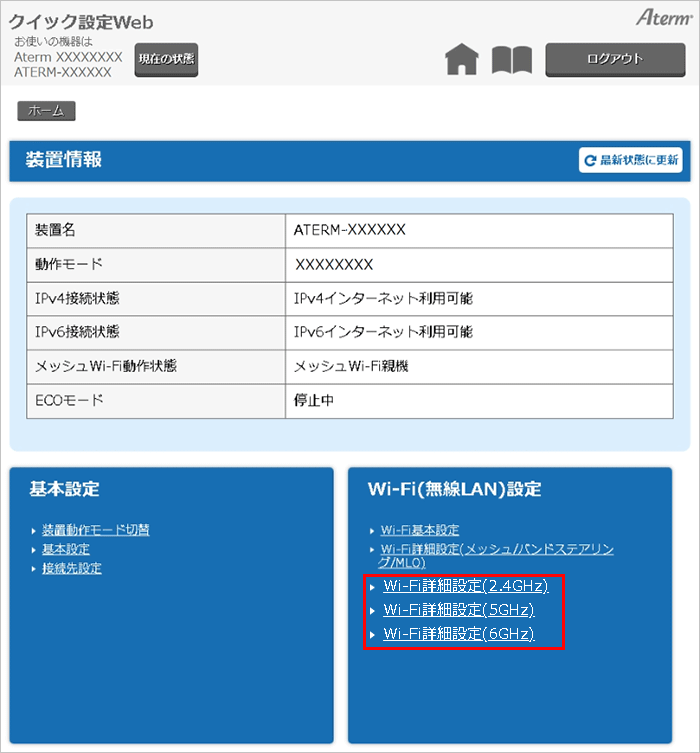 クイック設定Webのホーム画面で、『Wi-Fi詳細設定(2.4GHz)』または『Wi-Fi詳細設定(5GHz)』、『Wi-Fi詳細設定(6GHz)』を選択してください。
