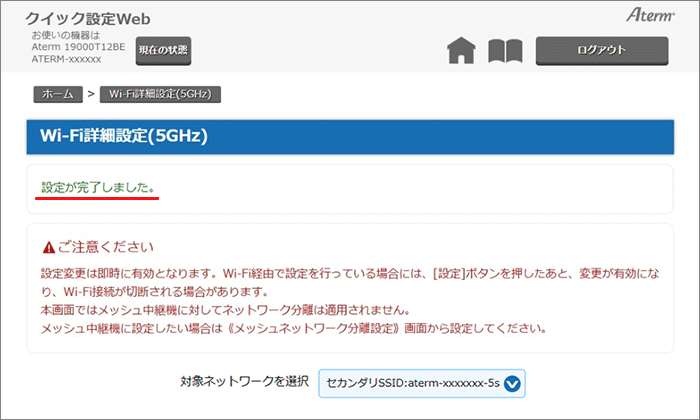 タイトルの下に「設定が完了しました。」と表示されます。