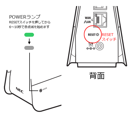 Aterm本体の背面にあるRESETスイッチを、つまようじの先で押し続け(*1)、POWERランプが赤点滅を始めたら放してください。