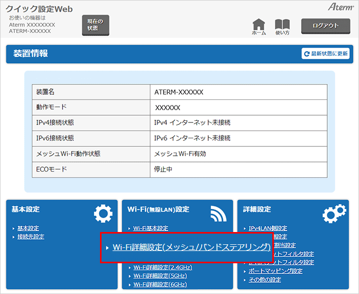 2.4GHz / 5GHz / 6GHz帯が共通の設定内容のため、『Wi-Fi詳細設定(メッシュ/バンドステアリング)』で確認を行います。