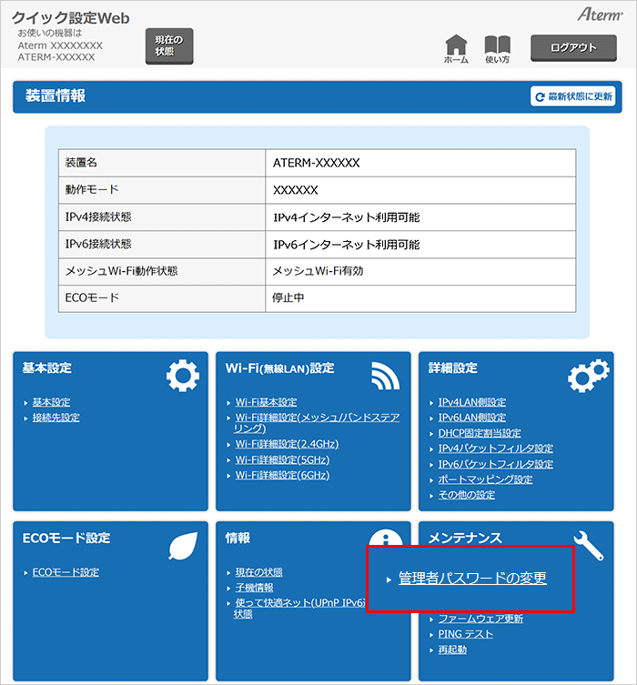 クイック設定Webのホーム画面で、『メンテナンス』-『管理者パスワードの変更』を選択してください。