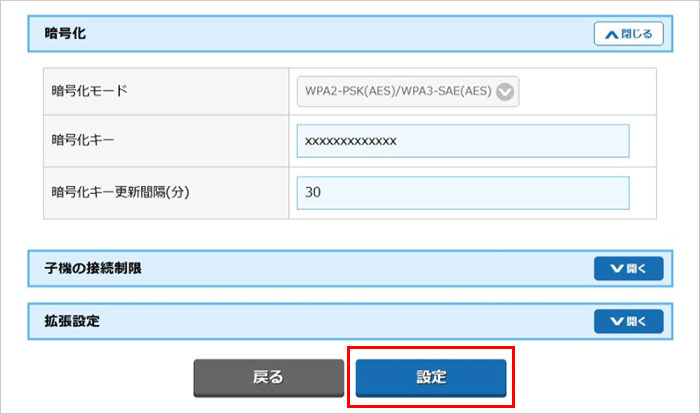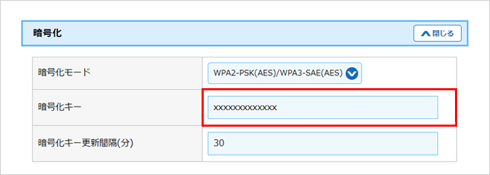 なお、WPA3-SAE(AES)が含まれる暗号化モードを選択した場合、使用できる文字は8〜63桁の半角英数字のみです。