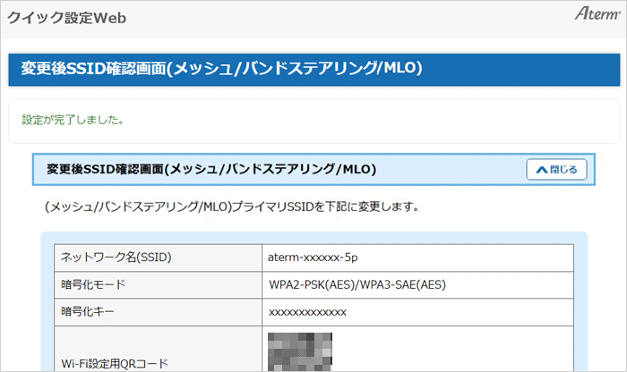 Atermと端末を有線(ETHERNETケーブル)で接続している場合などは、『変更後SSID確認画面』に遷移し、「設定が完了しました。」と表示されます。