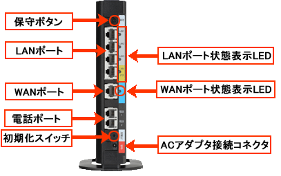 LAN1〜LAN4 | パソコンまたはゲーム機などを接続します。 ※LAN4/STBポートは本製品前面のSTBランプが消灯している場合はLANポートとしてご利用いただけます。 |