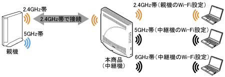 中継機(本商品)と子機間は、2.4GHz帯/5GHz帯/6GHz帯のうちいずれか2つを同時に使用することができます。子機は、同時使用している2つの周波数帯のうちいずれかのネットワークを選択して接続することができます。親機と中継機(本商品)間は、2.4GHz帯、5GHz帯または6GHz帯で通信します。