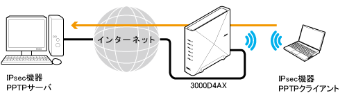 IPsecまたはPPTPによるVPN接続を使用することにより、インターネットを経由してLAN側のIPsec機器/PPTPクライアントからWAN側のIPsec機器/PPTPサーバにアクセスすることができます。また、本商品の動作モードがPPPoEルータモードまたはローカルルータモードの場合は、WAN側のIPsec機器/PPTPクライアントからLAN側のIPsec機器/PPTPサーバにアクセスするように設定することも可能です。