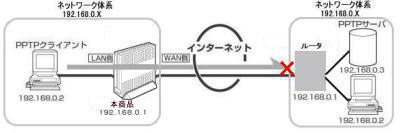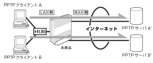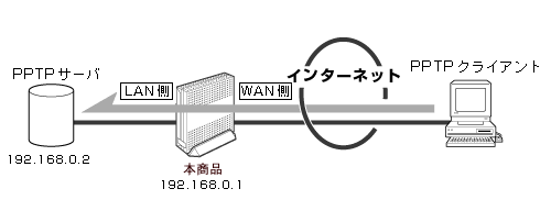 | <利用例1> 本商品に接続したPPTPクライアントからPPTPサーバに接続する ![]() | |