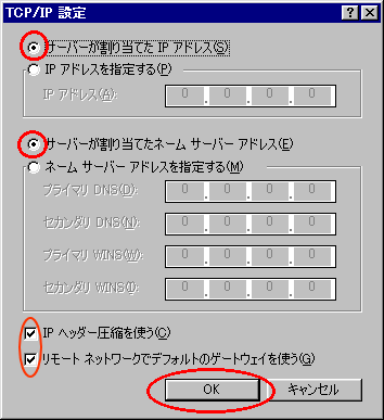 ネームサーバーアドレス]をクリックし、 [IPヘッダー圧縮を使う]と