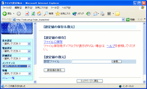 現在の本商品の設定内容をファイルに保存および復元をすることができます。 設定内容をパソコンのハードディスクにバックアップファイルとして保存しておくと、 保存済みのバックアップファイルから本商品に設定内容を復元することも可能です。 | ||||||||||||