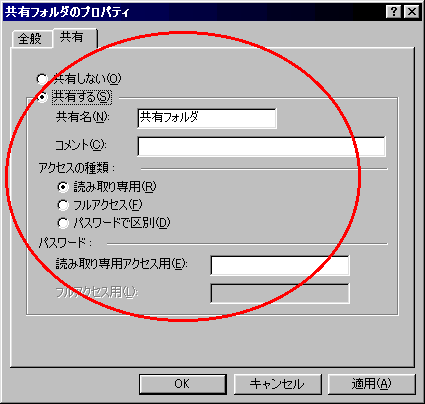 [共有する]をクリックし、[共有名]・[アクセスの種類]・[パスワード]を