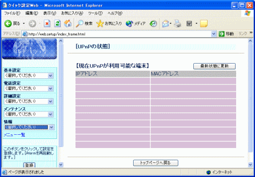 現在接続されているUPnPのパソコンのIPアドレスと MACアドレスを表示します。