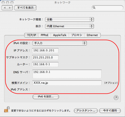 | 4. | [IPv4の設定]のポップアップメニューから[手入力]を選択し、下記のように設定する