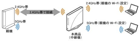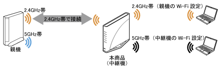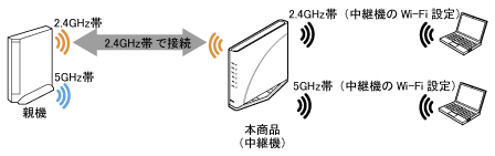 親機と中継機(本商品)間、中継機(本商品)と子機間ともに2.4GHz帯で通信します。