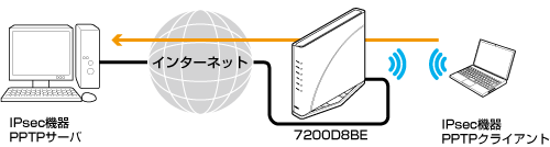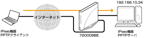 IPsecまたはPPTPによるVPN接続を使用することにより、インターネットを経由してLAN側のIPsec機器/PPTPクライアントからWAN側のIPsec機器/PPTPサーバにアクセスすることができます。また、本商品の動作モードがPPPoEルータモードまたはローカルルータモードの場合は、WAN側のIPsec機器/PPTPクライアントからLAN側のIPsec機器/PPTPサーバにアクセスするように設定することも可能です。