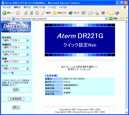 「クイック設定Web」を起動するとメニュー画面(トップメニュー)が表示