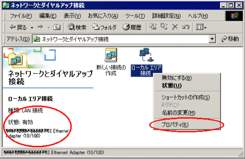 [ローカルエリア接続]を右クリックし、[プロパティ]を選択する |